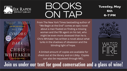 We're excited to host the Elk Rapids District Library's Books on Tap in May! We've got a tent, heaters, and lots of seating, along with some charcuterie and small bite options for purchase. Enjoy a glass of wine while discussing All the Colors of the Dark by Chris Whitaker.