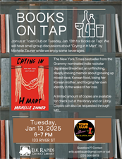 Join us at Town Club on Tuesday, Jan. 13th for Books on Tap! We will have small group discussions about “Crying in H Mart” by Michelle Zauner while we enjoy some beverages.