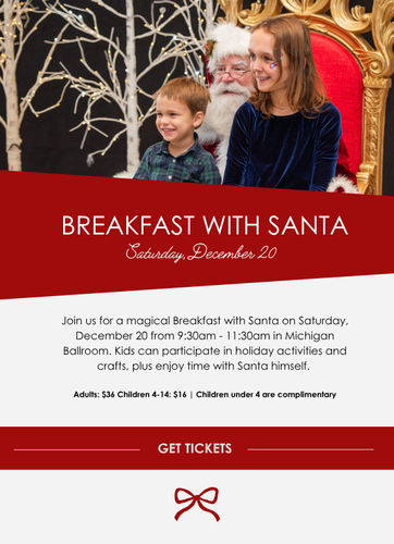 Join us for a magical Breakfast with Santa in the Michigan Ballroom. Kids can participate in holiday activities and crafts, plus enjoy time with Santa himself.
