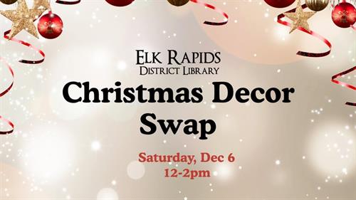 Join us at the Elk Rapids Library on Saturday, December 6 from 12-2 for a Christmas swap! Bring your gently used, indoor decor (no trees please) to donate or swap for something different. Don’t have anything to bring? No problem! We’ve got you covered.