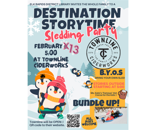 Bundle up for Destination Storytime and BYOS (Bring Your Own Sled)! The whole family is invited to Townline Ciderworks for stories outside, sledding and Ms. Kate's famous Hot Cocoa for the kids! Townline will be open, too. All ages welcome.