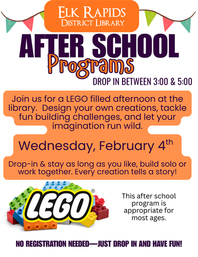 Join us for a LEGO filled afternoon at the library. Design your own creations, tackle fun building challenges, and let your imagination run wild. Drop-in & stay as long as you like, build solo or work together. Every creation tells a story!
