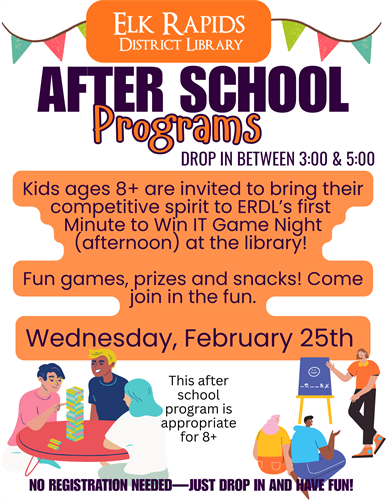 Kids ages 8+ are invited to bring their competitive spirit to ERDL’s first Minute to Win IT Game Night (afternoon) at the library! Fun games, prizes and snacks! Come join in the fun.