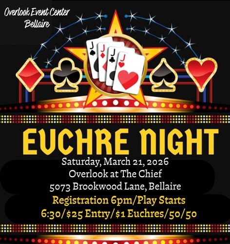 Join us for Euchre Night at Overlook! Doors open at 6:00 PM, and the cards start flying at 6:30 PM. It's $25 per person for a night of fun, competition, and maybe a few euchre surprises! Grab your tickets in advance on My Tickets North or snag them at the door. See you there for some serious euchre action!