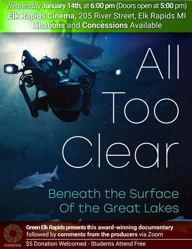 Wednesday, January 14-Green Elk Rapids presents the award-winning documentary All Too Clear: Beneath the Surface of the Great Lakes.