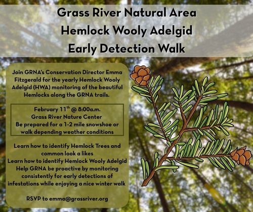 Learn how to identify Hemlock Wooly Adelgid. Help GRNA be proactive by monitoring consistently for early detections of infestations while enjoying a nice winter walk.