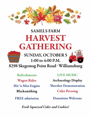 Samels Farm hosts Fall Harvest Gathering The Samels Family Heritage Society welcomes the public to their popular Harvest Gathering taking place on Sunday, October 5 from 1:00 to 4:00 p.m. at the historic Samels Farm located at 8298 Skegemog Point Rd. in Williamsburg. This year’s event features wagon rides, blacksmithing, hit ‘n miss engine, archaeology display, cider pressing, thresher demonstration, live music, fresh apple cider and cookies, along with other refreshments. Our own delicious maple syrup will be on sale. Admission is free and donations are welcome. See you there! For more information, visit samelsfarm.org, or facebook.com/samelsfarm/