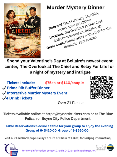 Celebrate Valentine's Day with a thrilling twist at Overlook at The Chief! Join us on February 14, 2026, for a Murder Mystery Dinner you won't forget. Enjoy a delicious buffet featuring a prime rib carving station while you put your detective skills to the test. And the best part? A portion of the proceeds benefits Relay for Life! Get your tickets now for a night of mystery, romance, and giving back. Single ticket sales welcomed!