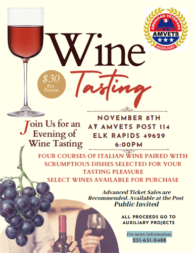 Join us for an evening of wine tasting four courses of Italian wine paired with scrumptious dishes selected for your tasting pleasure.  Select wines available for purchase!  Advanced Ticket Sales are Recommended. Available at the Post Public Invited.  All proceeds go to Auxiliary projects. For more information: 231-631-0488